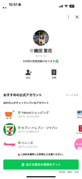 リンクをタップするとLINEの友だち追加画面が。「織田 里花」という謎のアカウント