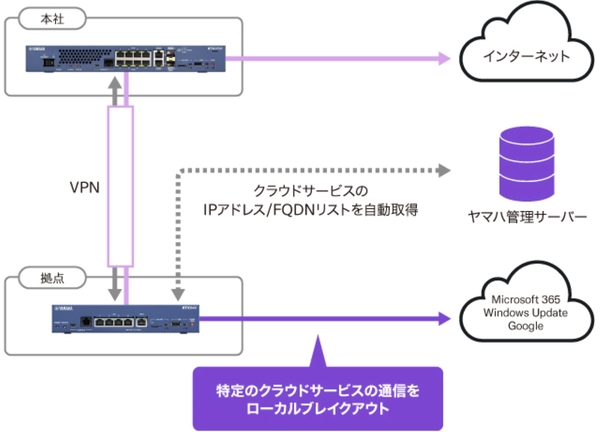 また、通信先リスト(IPアドレスまたはFQDNで定義)によるローカルブレイクアウト機能を標準搭載している。設定が簡単なうえ、Microsoft 365やWindows Update、Google系サービスといった主要のクラウドサービスは、ヤマハから最新の通信先リストが自動配信されるため、面倒なリストのメンテナンス作業なしで利用できる。