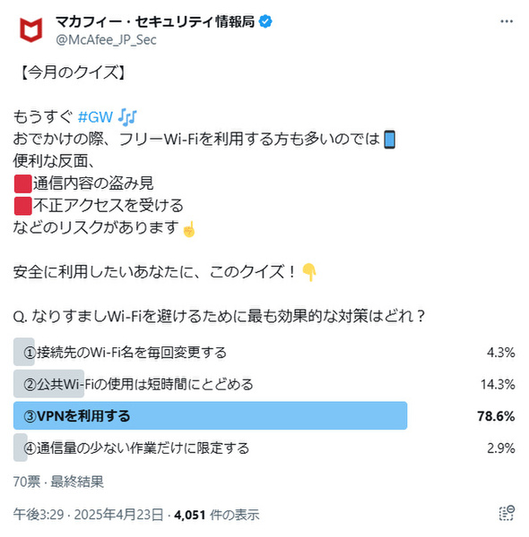 X(Twitter)アカウント「マカフィー・セキュリティ情報局」の2025年4月分のアンケート投稿から、今回は「フリーWi-Fiにまつわるセキュリティクイズ」をピックアップしてみました。