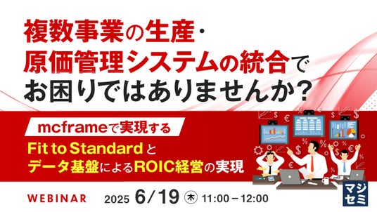 本セミナーでは、製造業向け統合業務システム「mcframe」を活用し、分断されたシステムや煩雑な原価集計、非標準化の業務プロセスといった長年の課題を見直し、ROIC経営に向けた「Fit to Standard」による全体最適の仕組み化をご紹介します。