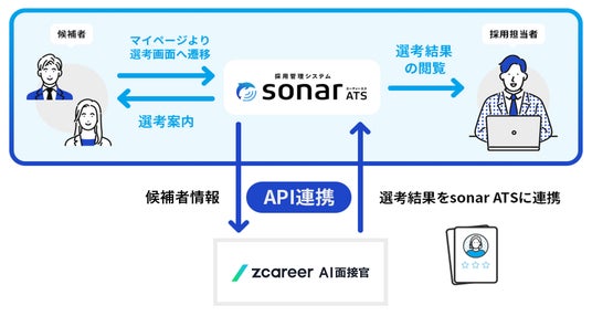 組織づくりのプラットフォーム「sonar HRテクノロジー」を展開するThinkings株式会社(シンキングス、本社:東京都中央区、代表取締役社長:吉田 崇)は、提供する「採用管理システムsonar ATS( https://hr.sonar-ats.jp/20250528_zcareer )」と、株式会社ROXX(本社:東京都新宿区、代表取締役社長:中嶋汰朗)が提供する採用支援サービス「Zキャリア AI面接官」とのAPI連携を開始しました。これにより、候補者は「sonar ATS」を通してシームレスに「Zキャリア AI面接官」での選考を受けることができ、企業側は選考の案内から進捗状況、選考結果の確認までを「sonar ATS」上で効率的に行えるようになります。