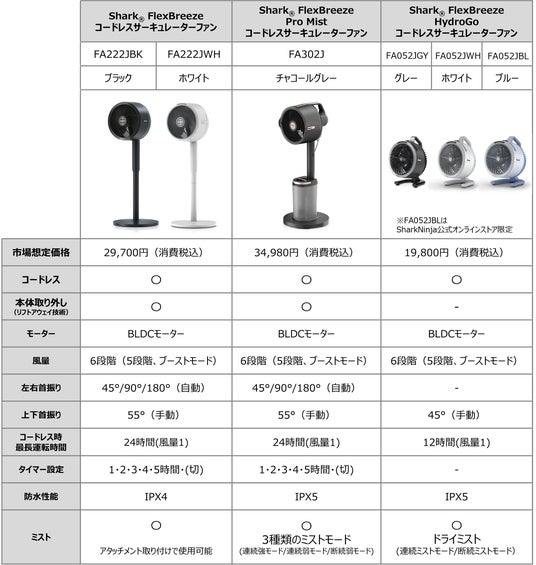 「Shark(R) FlexBreeze」シリーズ スペック比較表