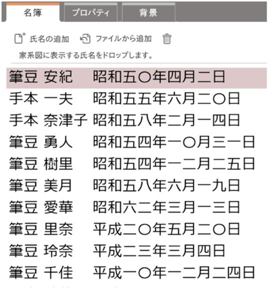 まずは家系図に載せる人物の名簿を作成します。最低、氏名と性別を入れれば家系図は作れます。生年月日や写真など、より詳細な情報も加えられます。