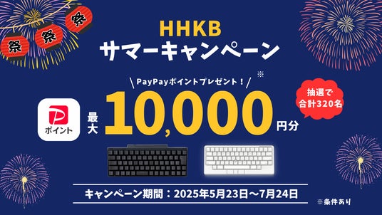 ・現在、HHKB本体をご購入いただいた方の中から抽選で合計320名様に最大10,000円分のPayPayポイントが当たる「HHKBサマーキャンペーン」を実施中です。ぜひこの機会にご応募ください。