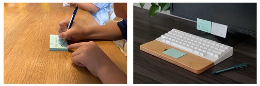 ・「タイピングベッド(クリアー)ふせんポケット」は、中央に50×75mmのふせん紙が収納できるタイピングベッド(パームレスト)です。ソリや捻じれが生じにくいプライウッド製で、快適なタイピングに不可欠な水平性をいつまでも保ってくれます。プログラミングの最中や文章の執筆中、思いついたことや迷ったことをふせん紙にささっと手書きでメモすれば、作業や仕事の効率UPに繋がります。
