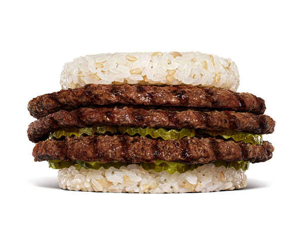 バーガーキング自慢の直火焼きの100%ビーフパティ3枚をシンプルに塩コショウで味付けし、アクセントのピクルス11枚を重ね、厳選吟味された白米と金のいぶき(玄米)をブレンドした「特製ライスパティ」で豪快にサンド。お肉とお米のおいしさを存分に楽しめるという大型ごはんバーガー。
