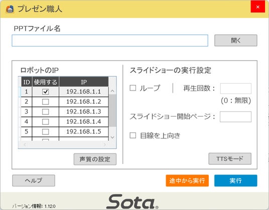 (※3)「プレゼンSota」における効果音再生機能は、本製品「プレゼンくるみちゃん」には搭載されておりません。効果音の指定を含んだPowerPoint(R)プレゼンテーションファイルを「プレゼンくるみちゃん」宛てに再生した場合、当該箇所でロボットの動作が停止します。そのため、「プレゼンSota」と混在して使用する場合、効果音再生機能を用いないプレゼンテーションファイルとする必要があります。