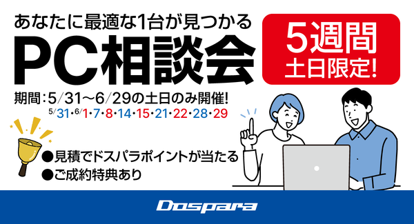 サードウェーブは5月30日、全国のドスパラ店舗にて「5週間土日限定!あなたに最適な1台が見つかるPC相談会」を5月31日から6月29日までの土曜日と日曜日に開催すると発表した。