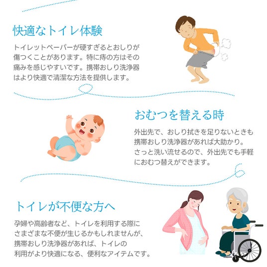 「外でも清潔を保ちたい」「災害時にも安心できるアイテムが欲しい」そんな声に応える本製品は、持ち運びやすく使いやすいデザインに加え、多彩な機能を搭載。アウトドア・旅行・介護・防災など、あらゆるシーンで活躍します。