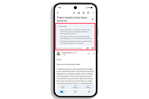 これまでもGmailでは、メール上部のボタン操作でGeminiがメールスレッドを要約する機能が提供されていた。今回のアップデートでは、特に要約が効果的な長いメールや多数の返信があるメールの場合、メール本文の上部にGeminiが生成した要約カードが自動で表示されるようになる。これにより、ユーザーはメールを開くだけで、スレッド全体の主要なポイントを素早く把握できる。Geminiはスレッド内の重要な情報を統合し、その後の返信内容も反映して常に最新の要約を提供するという。