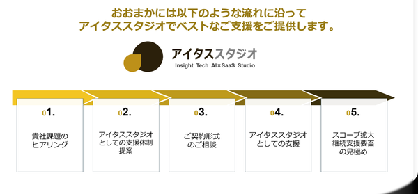 各機能を必要な部分だけを組み合わせて提供することもできるそうだ。支援までの流れとしては、顧客の課題をヒアリングして、「アイタススタジオ」としての支援の範囲や内容を具体化しながら、それぞれに適したプランを提案するという。