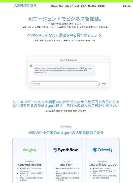 Agentoolsは、これらの課題を捉え、最適なAIエージェントのレコメンドに留まらず、中小零細企業・個人の皆様がAIエージェント導入の初期段階で直面するこれらの障壁を取り除くためのコンサルティングを格安で提供しています。このサポートを通じて、AIの恩恵をより多くの方に、より手軽に届けてまいります。
