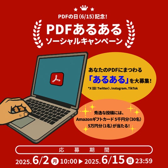 アドビ株式会社(本社:東京都品川区、代表取締役社長:中井陽子、以下アドビ)は、6月15日の「PDFの日」を記念して、2025年6月2日(月)10時00分から6月15日(日)23時59分まで、「PDFあるある」ソーシャルキャンペーンを開催します。