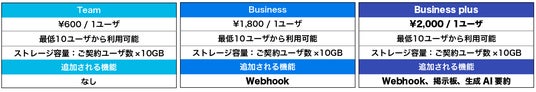 今回のバージョンアップにともないプラン改定を実施し、最上位プラン「Business plus」を追加いたします。BusinessプランではWebhook機能、Business plus プランではWebhook、掲示板、生成AI要約のすべての機能がご利用いただけます。