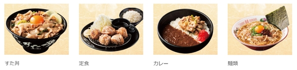 また、B賞では「丼/定食/カレー/麺」から1品、C賞では「すた丼」「生姜焼き丼」「肉すたみなカレー」から1品、D賞では「唐揚げ3種」や「豚汁サラダセット」から1品が無料になります。