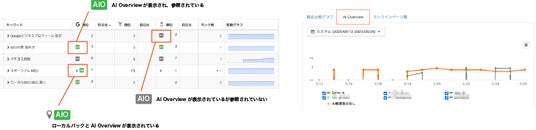 - AIO表示の有無と参照状況の可視化キーワードごとにAI Overviewが表示されているか、また自社サイトがそのAIOに参照されているか(緑色のアイコンで表示)を一目で確認できます。PCとスマートフォンのどちらのデバイスで表示されているか 、ローカルパック(地図情報)と併せて表示されているかなども把握可能です。