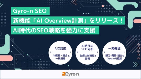 株式会社ユニヴァ・ジャイロン(東京都港区/代表取締役社長CEO・島津久厚)は、Webサイトの集客支援に特化したSEOツール「Gyro-n SEO」に、Googleの検索結果においてユーザーの検索キーワードに応じて上部に表示されるAIによる要約回答エリア「AI Overview(AIO/AIによる概要)」の表示状況を詳細に計測できる新機能「AI Overview計測」を本日2025年6月3日にリリースしました。本機能により、AI時代における検索エンジンの新たな動向を把握し、従来のSEOに加えて、ゼロクリック検索領域での「可視性」を最大化する戦略の立案と効果検証を強力に支援します。