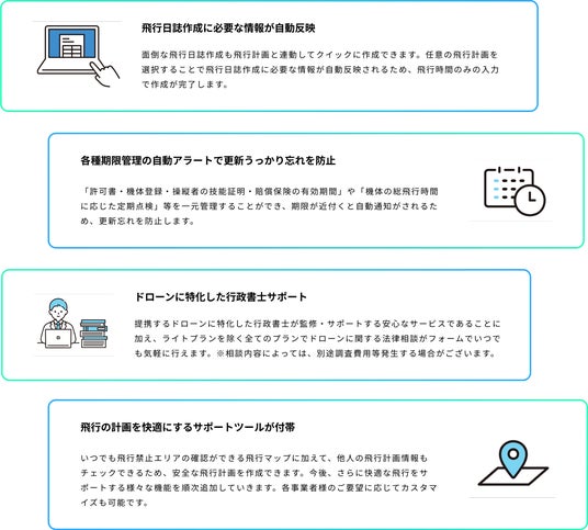 本サービスは、国土交通省の「DIPS(ドローン情報基盤システム2.0)」と連携し、機体登録、飛行許可申請、飛行計画通報、飛行日誌作成といった煩雑な手続きを一元管理することが可能です。さらに、運用を効率化するための、便利な機能も搭載しています。