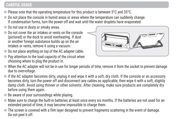 また、そのほかの注意喚起としては「明るい部屋でプレイしてください」「1時間に1回以上、10~15分の休憩を取ってください」といった基本的な文言が含まれている。