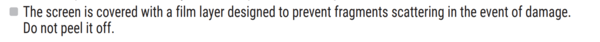 そのなかに「画面には、破損時に破片が飛び散るのを防ぐためのフィルムが貼られています。剥がさないでください。」という文言があり、最初から貼られているフィルムをはがさないようにしてほしいとしている。