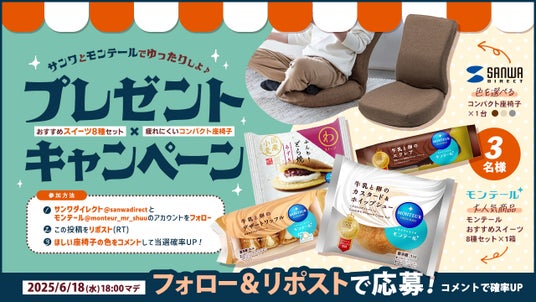 サンワダイレクトの公式X(旧Twitter)では大決算祭を記念して、『おすすめスイーツ8種類セット&疲れにくいコンパクト座椅子』が3名様に当たる、『株式会社モンテール』様とのスペシャルコラボプレゼントキャンペーンが開催決定!