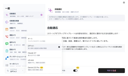 この度の大型アップデートでは、以下の5種類の最新AIモデルを搭載。用途や記録シーンに応じて最適なAIを選択できる柔軟性がさらに高まりました。