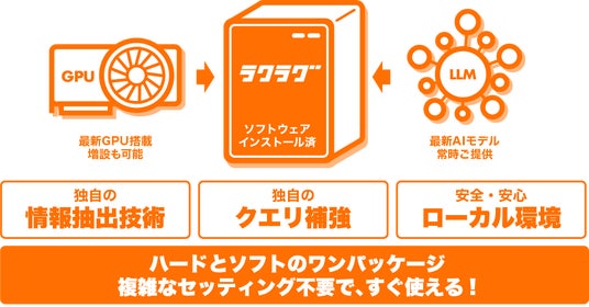 「ラクラグ」は、これらの課題に対応するため、完全ローカル環境で運用可能であり、ハードウェアとソフトウェアをワンパッケージ化することで複雑なセッティングが不要なLLMソリューションとして開発されました。高度な画像解析技術と自然言語処理により、自社のノウハウや知識を資産として、安全かつ有効に活用するための基盤を提供します。