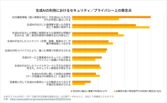 JIPDECと株式会社アイ・ティ・アール(ITR)が2025年3月に実施した「企業IT利活用動向調査2025」によると、生成AIを全社的に利用している企業のうち59.9%が「機密情報の外部漏えい」を懸念しており、特定部門で利用している企業でも59.1%が「誤情報の利用による業務影響」を懸念していることが明らかになっています。