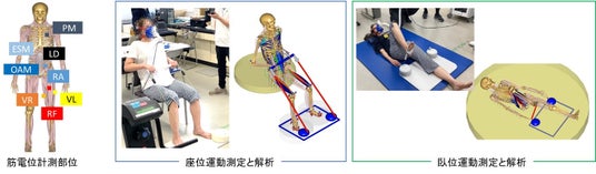 「walkey device」は、適度な負荷を安定してかけながら運動を行うことで、関節可動域や筋力バランスを整え、身体機能を高めることができるワイヤー型のリハビリマシンです。特に、運動機能に制限のある患者様や、入院中の患者様の運動療法、さらには在宅やクリニックでのリハビリにおいても、立位、座位、臥位での運動を安全かつ効率的に実施できることが特長です。今回の研究では、上肢・下肢に筋電位マーカを装着し、呼気ガス分析を組み合わせることで、筋負荷および心肺負荷を定量的に測定しました。さらに、筋骨格シミュレーションを用いることで、実際の運動時における負荷のかかり方を科学的に評価しました。