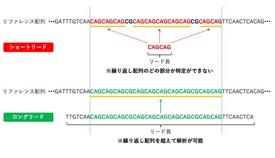現在、全ゲノム解析が可能な次世代シーケンサー(NGS)には、米国イルミナ社らが提供するショートリードシーケンサーと、米国パシフィック・バイオサイエンス・オブ・カリフォルニア(PacBio)社らが提供するロングリードシーケンサーの2種類があります。これまでは解析の精度や費用等の面からDNAを数百塩基の非常に小さな断片に切断し、それぞれを個別に解析するショートリードシーケンサーが主流となってきました。しかし、大きな欠失・挿入や重複、長いリピート伸長、逆位、転座等の複雑な構造バリアント(SV)の検出は難しいため、数千~数十万塩基の長い状態のままDNA配列を読み取り、SVも含めてより多面的に解析できるロングリードシーケンサーに注目が集まっています。