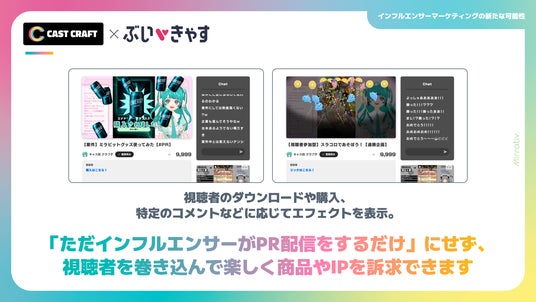 本キャンペーンでは、YouTubeやTwitch等でPR案件を予定しているクライアント・広告代理店様に向けて、「ぶいきゃす」、「CastCraft」と連携した演出付きのPR配信の特別プランをご提供。ゲーム会社様はもちろん、広告代理店・コンテンツホルダーなど、配信を活用した商品・サービスのプロモーションをご検討中の皆さまへ幅広くご活用いただけます。
