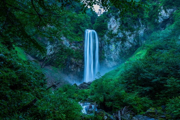 足湯を楽しんだら、次は落差64m、幅6mの飛騨三大名瀑の一つ「平湯大滝」へ。日本の滝100選にも選定されている平湯大滝は、鮮やかな緑に包まれた環境にあります。荒々しい断崖を大量の水が豪快に落ちる様は壮観です!