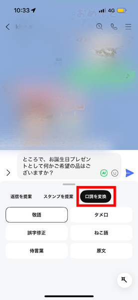 また、メッセージ欄に入力した文章は、「口調を変換」から「敬語」「カジュアル」「誤字訂正」「ねこ語」「侍語」の5つに変換もできる。