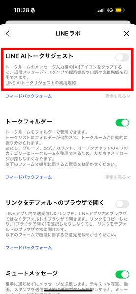 ホーム画面右上の歯車マークをタップして、設定画面を開く。続いて、「LINEラボ」をタップ。「LINE AIトークサジェスト」をオンにしよう。