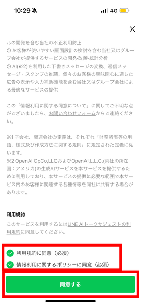 同意確認画面となるので、「利用規約に同意」「情報利用に関するポリシーに同意」にチェックを入れ、「同意する」をタップ。