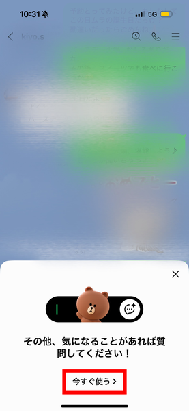 友だちとのトーク画面を開くと、入力欄に「AI」マークが表示されている。タップするとLINE AIトークサジェストの紹介が表示されるので、「今すぐ使う」をタップ。