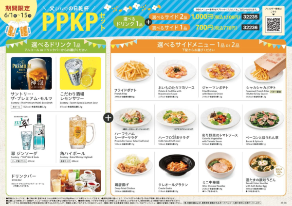 父の日に向けた特別メニュー「PPKPセット」(父=パパの日に乾杯)は、アルコールまたはドリンクバーから1品、サイドメニューは12種類の中から1品または2品選べるセット。サイド1品の場合は770円、2品の場合は1100円とお得な設定になっている。