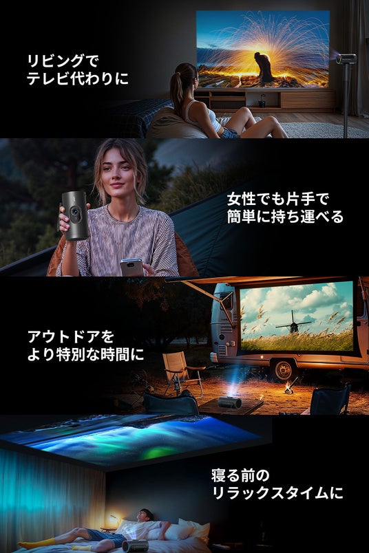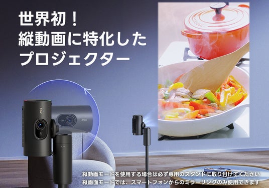 セット販売の専用スタンドには、20,000mAhの大容量バッテリーを内蔵し、最大4.5時間の連続再生が可能。縦型SNSコンテンツや動画配信サービスに最適化された"新感覚プロジェクター"です。
