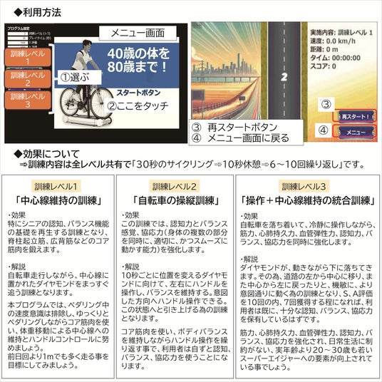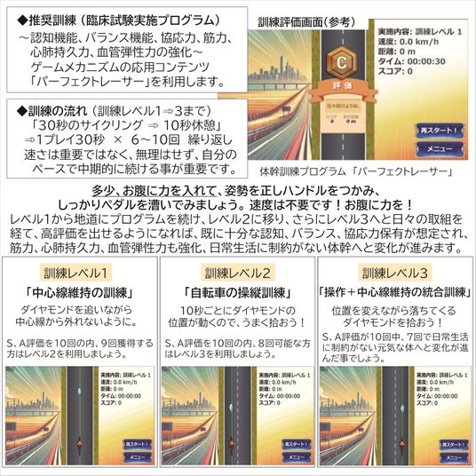 本プログラムは、ゲームメカニズムの応用コンテンツ「パーフェクトレーサー」という新たに追加されたゲームシステムを活用する歩行機能向上を目指す運動プログラムとなりますが、認知機能、バランス機能、協応力、筋力、心肺持久力、血管弾性力への影響も考慮した、過去、臨床試験でも実施した訓練プログラムとなります。