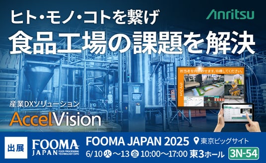 アンリツ株式会社(社長:濱田 宏一)は、2025年6月10日(火)から13日(金)まで東京ビッグサイトで開催されるアジア最大級の食品製造総合展「FOOMA JAPAN 2025」に食品工場向け産業DXソリューション「AccelVision(アクセルビジョン)」を出展します。