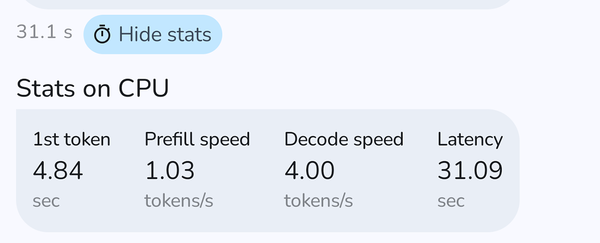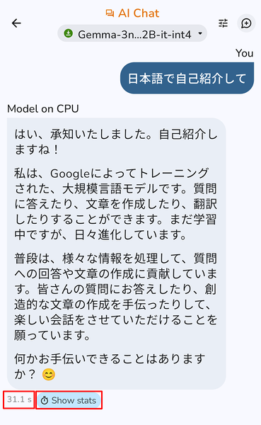 ChatGPTのようにスラスラとまではいかないが、そこそこのスピード(31.1秒)で回答が生成された。「Show Stats」をタップすると詳細を確認できる。