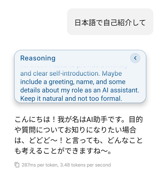1秒間に4トークンという生成速度は、ユーザーが読むペースとほぼ同等であり、回答を待つストレスは少ない。クラウドAIと比較すれば遅いものの、完全オフラインでこの性能が得られるのは画期的といえるだろう。