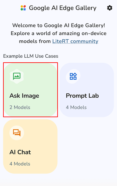 Gemma 3nはテキストだけではなく画像を使ったプロンプトも理解するマルチモーダルLLMだ。画像を使いたい場合は「Ask Image」からチャットウィンドウを開こう。