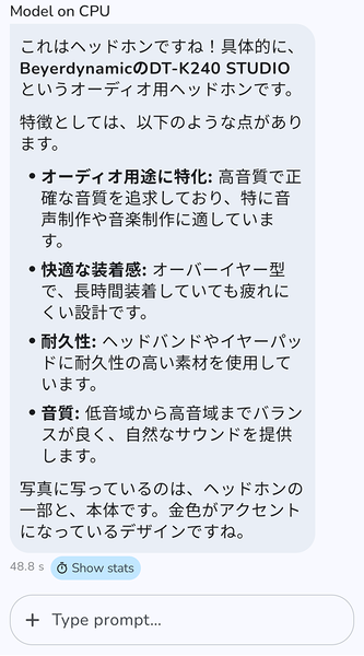 今回は「AKG」というメーカーのヘッドフォン、型番「K240 Studio」の写真をアップロードして「これはなに?」と聞いてみた。