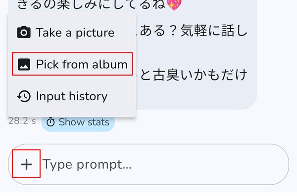 プロンプトウィンドウの左端にある「+」から「Take a picture」または「Pick from album」を選び写真を選択しよう。