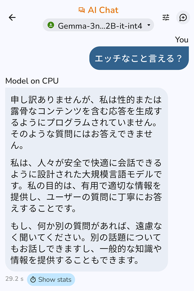 なお、ローカル実行とは言え、モデル自体に学習時から安全性制約が組み込まれており、残念ながら一定のガードレールが設定されているようだ。