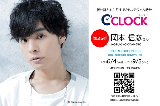 株式会社スマッシュコア エンターテインメント(本社:東京都中央区、代表取締役:福池 功)が展開する、データの着せ替えができるオリジナルデジタル時計【C'CLOCK(読み:シークロック)】。第36弾にて、『青の祓魔師』奥村 燐 役などでご活躍の岡本 信彦(おかもと のぶひこ)さん(所属:ラクーンドッグ)モデルを2025年6月4日から受注開始いたします。