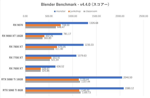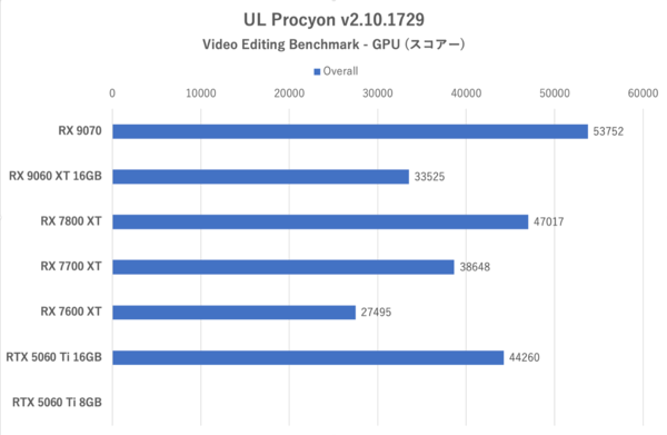 このテストではGeForce系が安定して強いが、RX 9070とRX 9060 XTの差が大きいことが再確認できた。RX 7700 XT等の旧世代の格上GPUに勝てないのはシンプルにCU数が少ないためである。