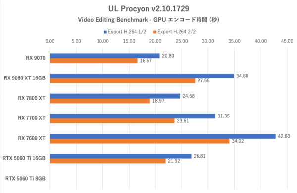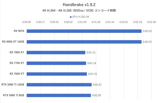 このテストではGPUのシェーダー部分も活用されるため、CU数の少ないRX 9060 XT 16GBは不利である。RX 7600 XTよりも個別のエンコード時間が確実に短縮されているが、格上であるRX 7700 XTを追い抜かすまでには至っていない。RX 9070シリーズのレビューでは、CU数の多いRX 7900 XT等に勝てないまでもかなり肉迫できていた(参考記事)が、今回は完全に下回ってしまった。