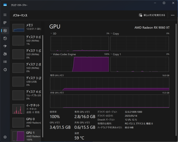Premiere Proに引き続き、RX 9060 XTのエンコード速度が遅いが、RX 9070も同程度に遅い。もしかしてRyzenの内蔵GPU(Radeon Graphics)側のエンコーダー(VCN)が動いているのではないかと疑ったが、タスクマネージャーの報告を見る限り、ビデオカード側のVCNが動いているようだ。これはHandbrakeの最新Nightly Buildを使っても変化なかったため、単純にエンコード処理の実装とGPUの組み合わせの問題といえる。
